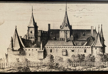 Aanzicht van de verdwenen burcht ‘Het Tolhuys’ met rechts de contour van de Dikke Toren. Fotoafbeelding (1,92x1,08 m) hangt nu in het Gezondheidscentrum Geuzenwaard. Het is een foto, gemaakt en vergroot door Hans Keuls (begin jaren ‘60), van een ets (126 x 262 mm) van Claes Jansz. Visscher (1649). Prenten ervan werden gedrukt en uitgegeven door J. Bleau, onder de titel “Het Tolhvis”, 1649’; een origineel is o.a. te vinden in het Gelders Archief (nr. 1551-1894).